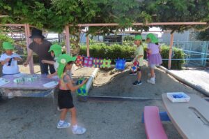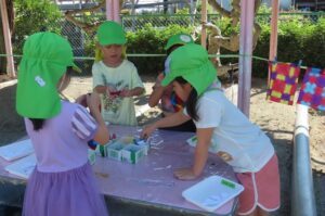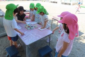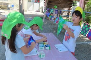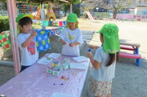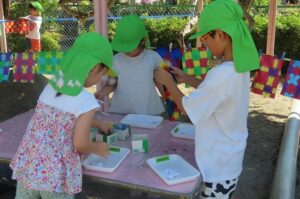 年長組が「染め紙」をしました。事前に折っておいた和紙に好きな色の染料をつけていきました。同じ色の染料を使っても染める場所や染める面積が違うことでみんな染め上がりが違います。何に使うのかはこれからのお楽しみです。