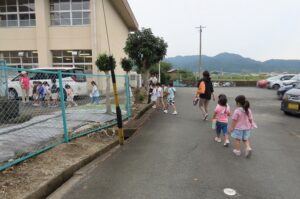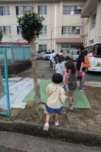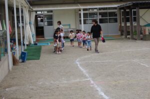 伊勢寺幼稚園では、月に1回避難訓練を実施しています。地震、火災、不審者・・・いろいろな災害を想定しています。今日は線状降水帯発生による浸水被害を想定して実施しました。幼稚園は平屋なので隣接する小学校へ避難しました。