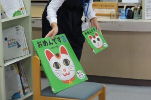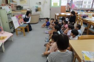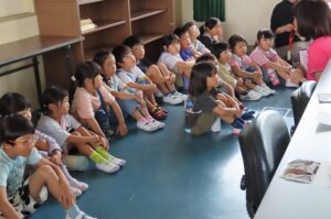 避難訓練の後は、校長先生に許可をもらって、学校たんけんをしました。図工の作品を廊下の棚に置きに来ている小学生の中に、お兄ちゃんやお姉ちゃんを見つけると、嬉しそうに手を振ったり声をかけたりしていました。読書室の前に行くと、司書さんが入っていいよと声をかけてくださいました。そして、大型絵本を読んでくださいました。大喜びの子どもたちでした。