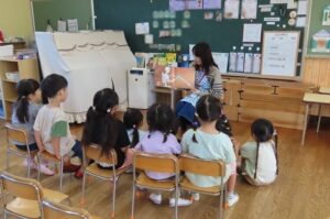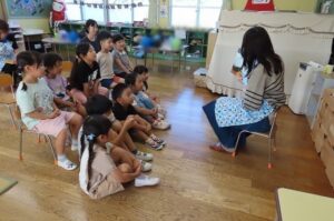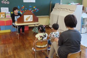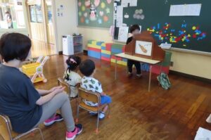 年少組は紙芝居「ころころじゃっぽーん」、絵本「こぶたのプーちゃん」「だーれのおしり?」でした。