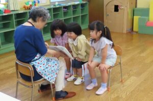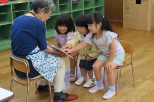 年長組の絵本は「しゃっくり ガイコツ」「だるまちゃんとてんぐちゃん」「わたしと なかよし」でした。