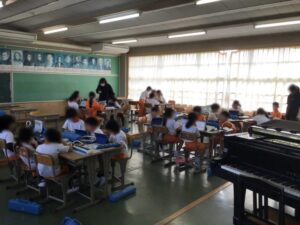 鍵盤ハーモニカでどのように演奏するか、グループで話し合っています。