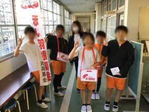 児童会の子どもたちが、今日から赤い羽根共同募金に取り組んでいます。