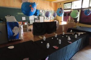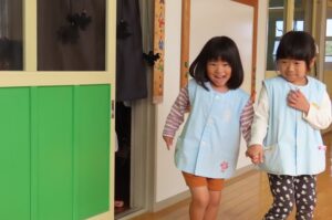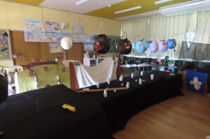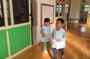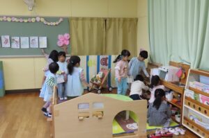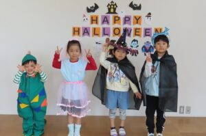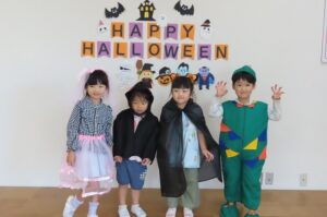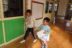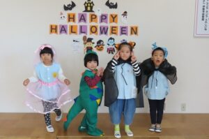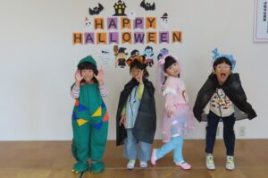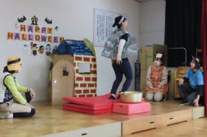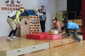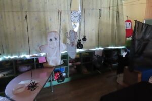 ハロウィーンも近いので、お楽しみ会をしました。まず、年長さんの「おばけやしき」です。年長さん最後の打ち合わせ中。