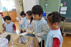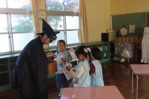 「まじょ み~つけた!」「とりっくおあとりーと」の合言葉でお菓子をもらいました。