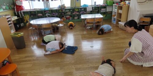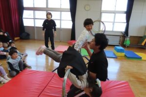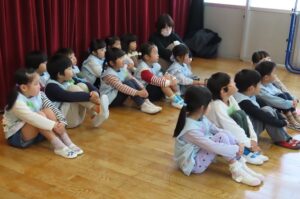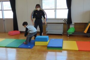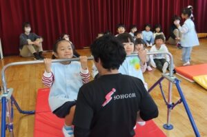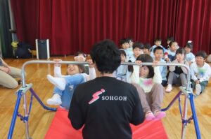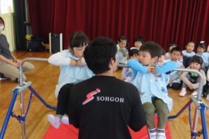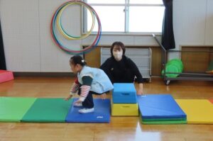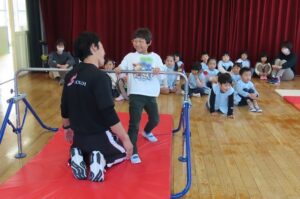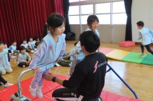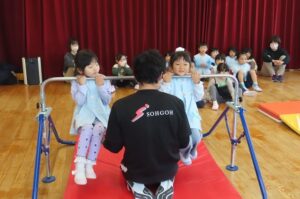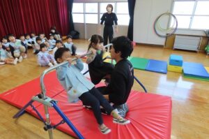 今日の体育で遊ぼうでは、てつぼうとマットをしました。先生の話をしっかり聞いています。