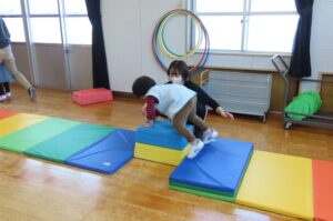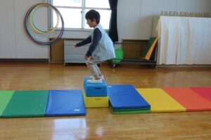 てつぼうの後は、両足をそろえてとびばこにぴょんと跳び乗ります。
