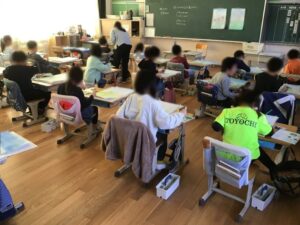 10月17日に「伊勢寺地域環境保全向上活動をする会」の方々と写生をしたコスモスの絵の色塗りをしています。