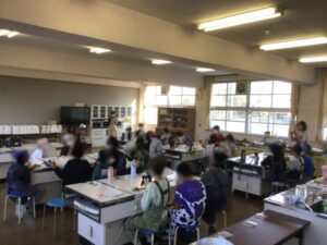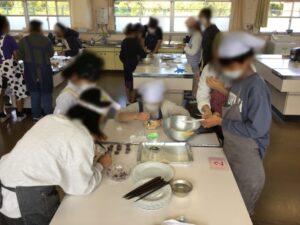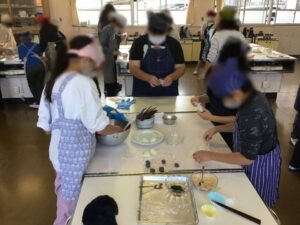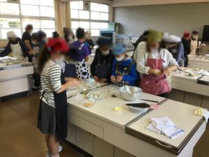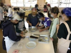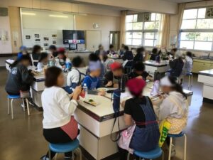 栄養教諭も一緒に学習しました。5月に田植えをして、9月に稲刈りをしてできたもち米でおはぎづくりです。