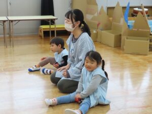 生活発表会に向けての活動中。年中さんの様子を見ている年少さん。