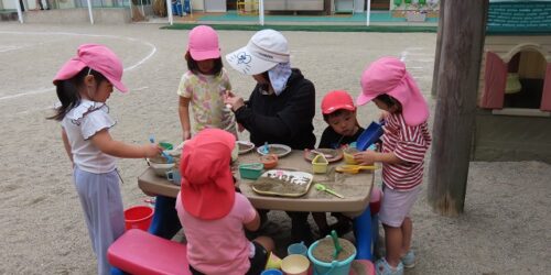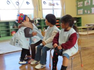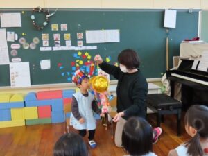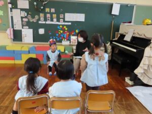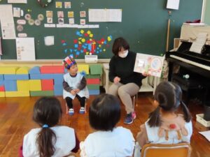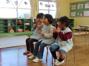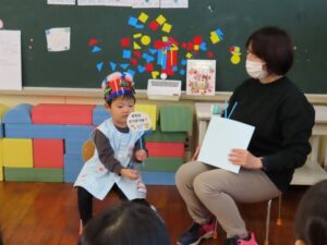 年中・年少組がお誕生会をしていました。まず、誕生日カードの紹介です。