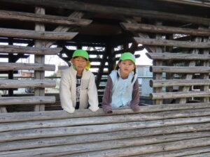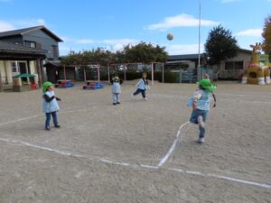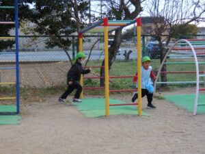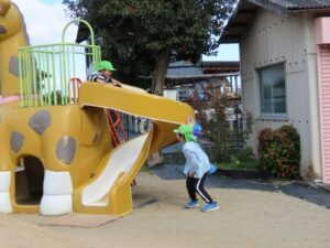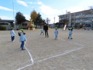 発表会に向けての活動の後、年長組は外で元気いっぱい遊びました。「しっぽ取り」をしたり
