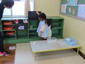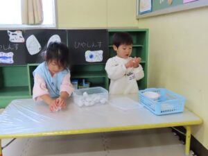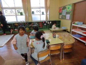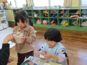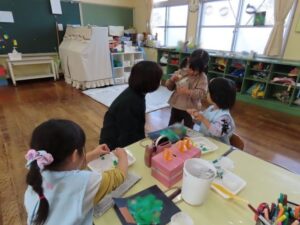 給食後の年中・年少組は保育室で製作や粘土遊びを楽しみました。