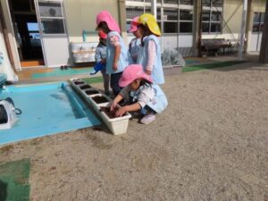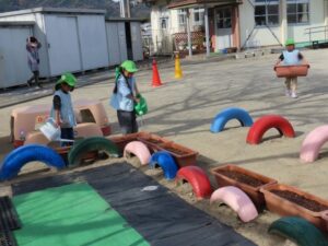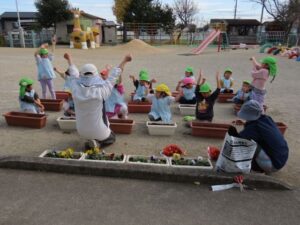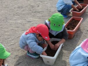 ひとり一つのプランターに植えていきました。自分の分が終わった年長さんが年少・年中組のお手伝いをしてくれました。
