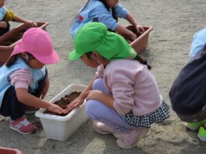 みんなでチューリップの球根植えをしました。お話を聞いて、
