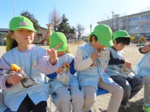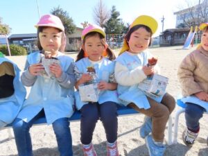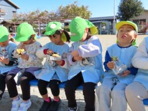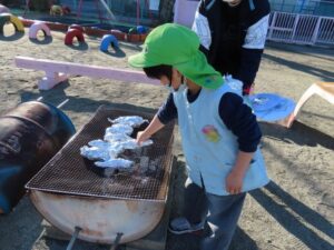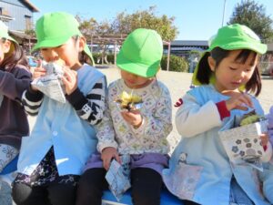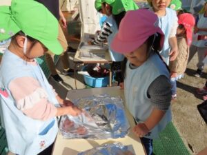 JAみえなか伊勢寺店の皆さんといきいきクラブの皆さんをお招きして日頃の感謝の気持ちを込めて焼きいもパーティーをしました。登園した子から焼きいもの準備をしました。昨日洗ったさつまいもをぬらした新聞とホイルで包みます。