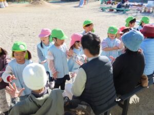 焼きいもができたのでお客さんに渡しました。「たべてください。」
