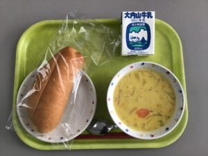 「コーン豆乳スープ」「キャベツ」「コッペパン」「牛乳」は、みんな一緒で・・・