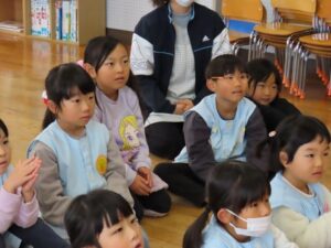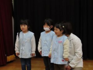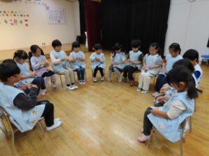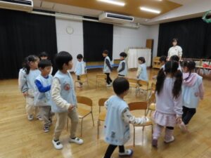 サンタさんは次の幼稚園に行かなければならないので、さよならをしました。帰られた後にいす取りゲーム(クリスマスバージョン)をしました。
