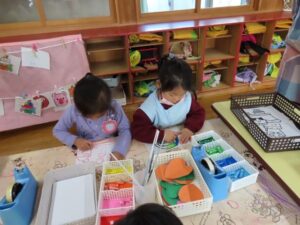 それぞれの部屋に分かれて遊びました。年少さんの部屋では色塗りをしました。