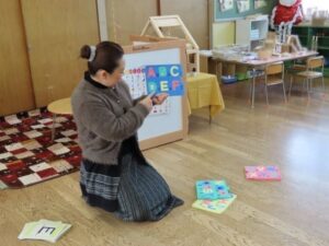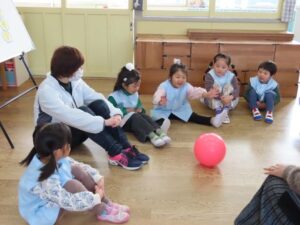 今日は「英語で遊ぼう」の日でした。先生と「Hello」とあいさつ。