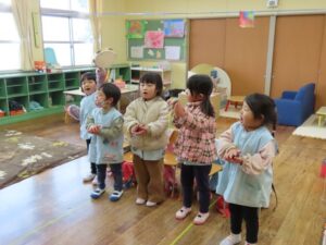 年中・年少組の降園活動は歌を歌いながら楽器を鳴らしていました。