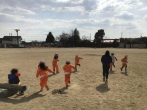 縄とびのあと、おにごっこをしました。10数えておにがスタート!