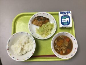 今日のメニューは、ご飯、牛乳、さばの竜田揚げ、キャベツとたくあんの和え物、まごころぽかぽか汁です。