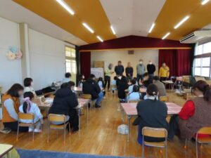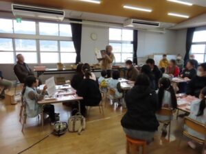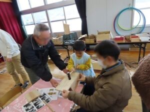 伊勢寺地区住民自治協議会「環境教育部」の皆さまにお世話になり、巣箱づくりをしました。まず、巣箱の話をしていただきました。