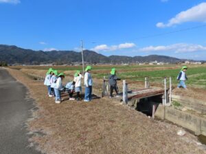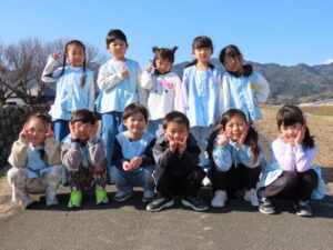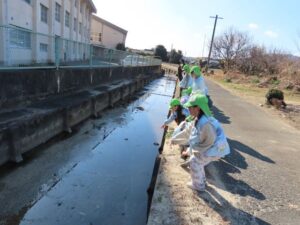 年長組が全員揃ったので、写真を撮りにいきました。用水路の水が凍っているようです。自分たちで氷を作ろうと容器に水を入れて園庭に置いていますが、凍っていません。どうしてここの水は凍っているのかな?