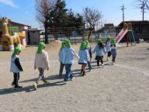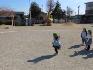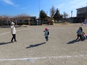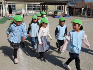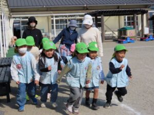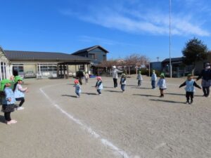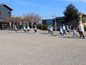 走り終わると、当番さんが次の指示を伝えます。「ちゅうりっぷさん、さくらさんは先生についていきましょう。」