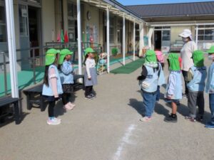 年長さんは指示を出すのが好きです。「○○いろのくつのひと、もどりましょう。」「じゃんけんをして とうばんにかったひとから もどりましょう。」・・・当番の人たちで相談して決めています。