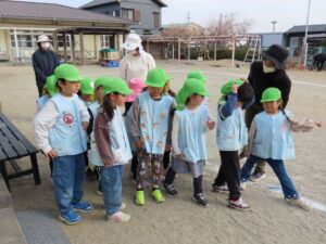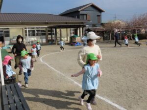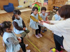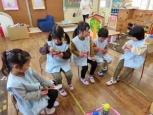 年中組は自分で小袋を開けられました。年少組は少し手伝ってもらいました。