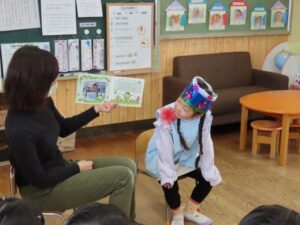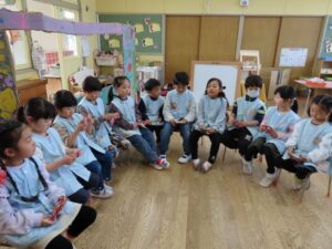 年長組は「お誕生日会」でした。歌を歌ったり誕生日絵本の紹介から始まりました。