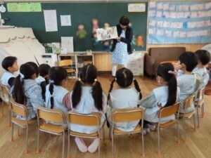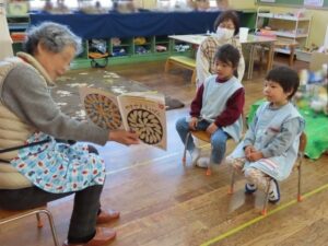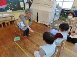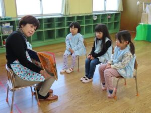 毎月楽しみにしている「えほんだね」さんによる読み聞かせがありました。年少組は「うずらちゃんのかくれんぼ」「おいしいおと!なんのおと?」「やきやきてっぱん」「これはねこです。」の絵本を読んでいただきました。