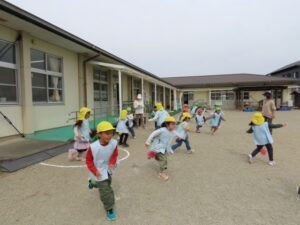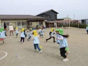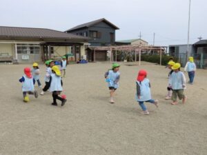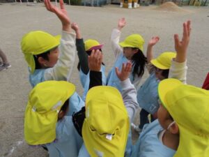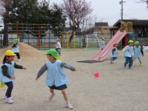 「しっぽとりをします。」「『だいやもんどぐるーぷ』と『さかな』ぐるーぷにわかれてください。」思い出遠足の時に活動したチーム対抗戦です。