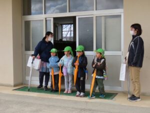 今日は小学生の下校に合わせて「伊勢寺」「深長」地区の子どもたちが職員の引率で下校体験をしました。一斉下校の始まるのを待っています。