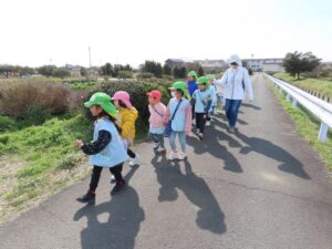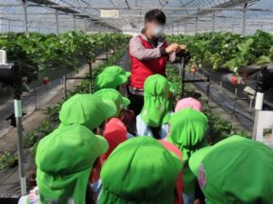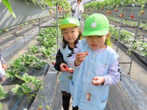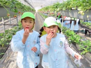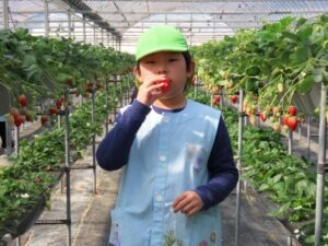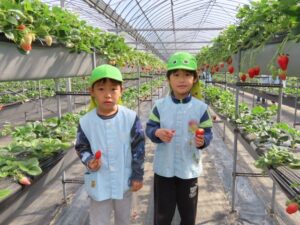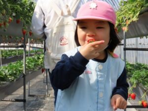 ハッピー農園まで歩いていっていちご狩りをしました。「ともだちといっしょに100こたべる。」「ぼくはかぞえやんといっぱいたべる。」と会話をしながら歩いていました。