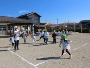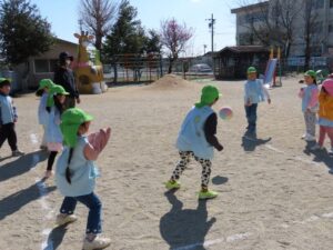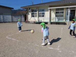 まずは外で『さくらんぼ体操』をして体をほぐしました。次はドッジボール。