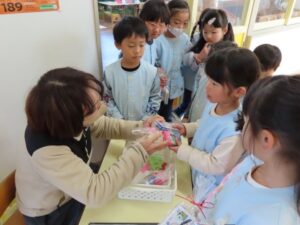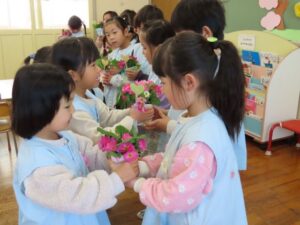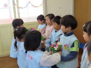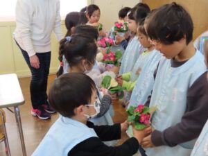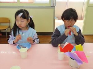 年中・年少さんが作った染紙で作ったカップに入れた花をプレゼントしました。