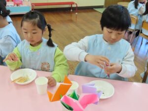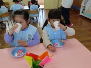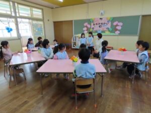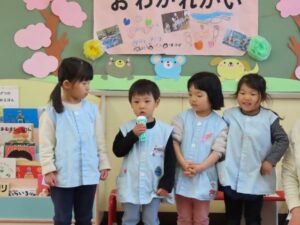 また一つ楽しい思い出が増えましたね。年中組は司会をがんばりました。会場の飾りも作りましたよ。4月からは年長組。伊勢寺幼稚園をよろしくね。