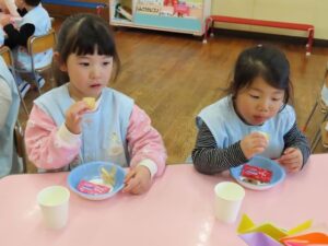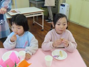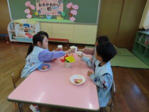 食べた後は、年少組は『年長さんとの楽しかった思い出』年中組は『年長さんのすてきなところ』を年長組に伝えました。「どっじぼーるをしたのが たのしかったです。」