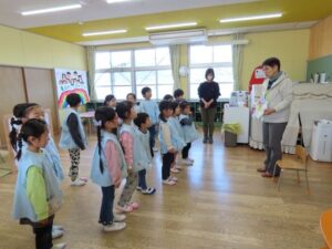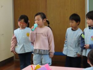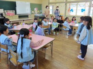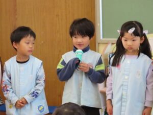 年長組は小学校でがんばることや楽しみなことを発表しました。「さんすうのべんきょうを がんがります。」「どんなともだちができるのか たのしみです。」