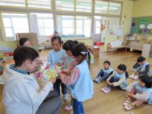 「こうりゅうかいで ようちえんにきたら いっしょにあそぼうね。」「しょうがっこうで がんばってください。」