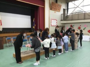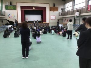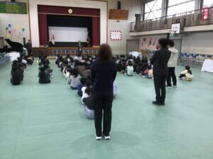子どもたちは、伊勢寺小学校を去る先生たち一人ひとりのお話をしっかりと聞いていました。