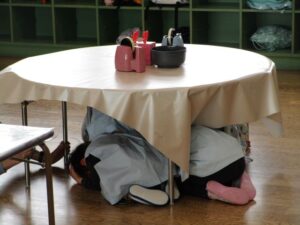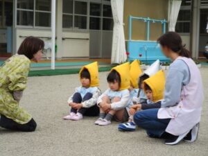 幼稚園では月に1回避難訓練をしています。今日は今年度初めての訓練(地震を想定)をしました。年少さんは初めてなのでテラスから見学でした。放送を聞いてダンゴムシのポーズで机の下にもぐれました。