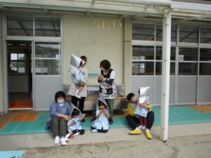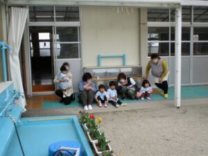 揺れが収まったので、園庭に避難しました。