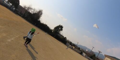 伊勢寺小学校の校庭を借りてたこあげをしました。まず、注意することを年長さんが確かめてくれました。「友だちが近くにいると糸...